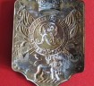 Rare Georgian military stove pipe shako plate. Brass plate with Royal Standards and GR to centre with royal lion below. Double fixing holes to each corner for fixing to Stove Pipe shako. A rare early Waterloo period shako plate.