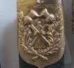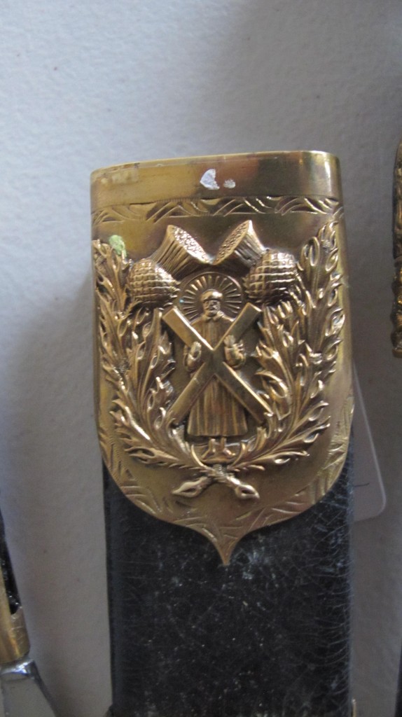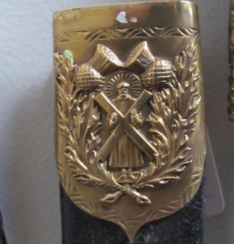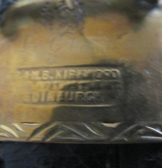 Good brass mounted Royal Highlanders Officers military Dirk. Plain piped back blade in good condition. Complete with its matching scabbard with thistle decorated mounts. Reverse of mounts with Kirkwood Edinburgh makers markings. Complete with its knife and fork. An impressive post WWII military Officers dirk.