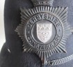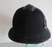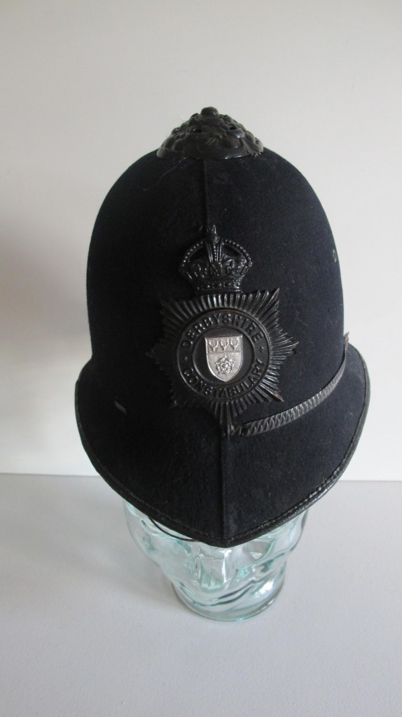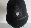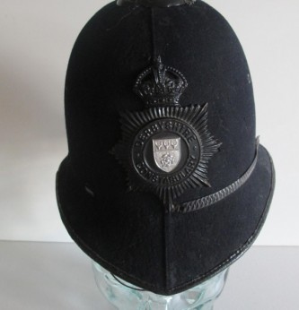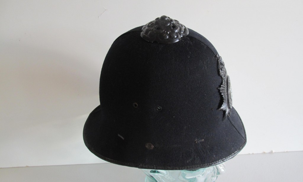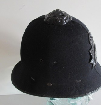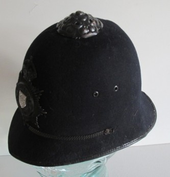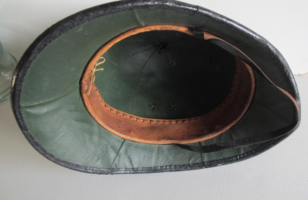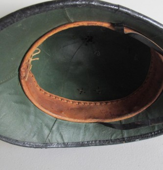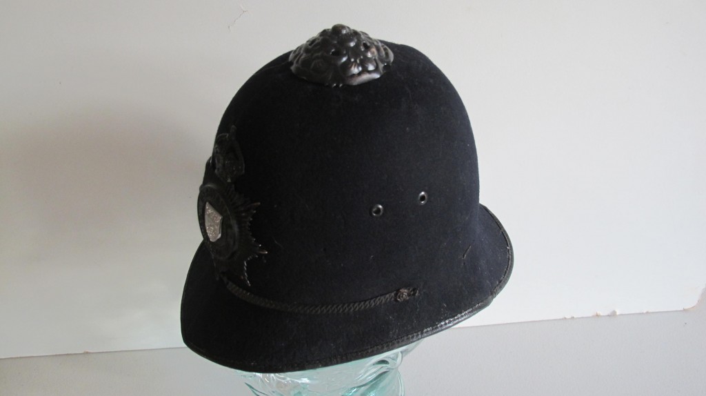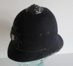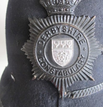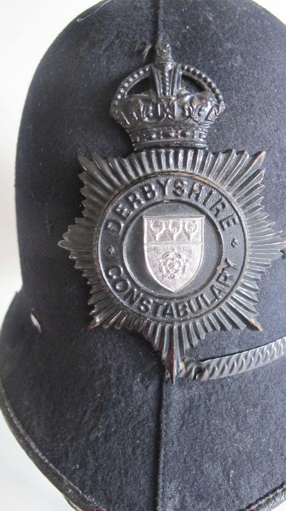 Wartime British Police cork helmet. Black out pattern with King crown Derbyshire Constabulary helmet plate to front. Complete with liner and chin strap. Small section of lower trim band missing – otherwise nice overall condition.