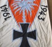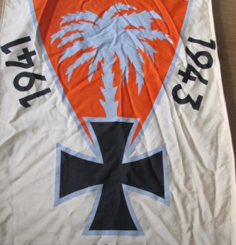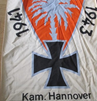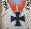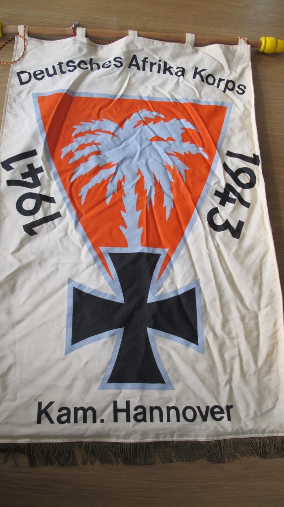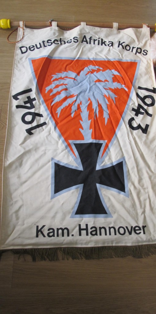 Large post war Afrika Korps Veterans Stadium banner. Measures 120 x 75cm. approx. For the City of Hannover. Produced for the veterans of the Afrika Korps who service from 1941-43. Banner printed with AK palm tree and dates 41-43 and Iron Cross. Gold fringing to bottom. On its original hanging pole. Excellent condition.