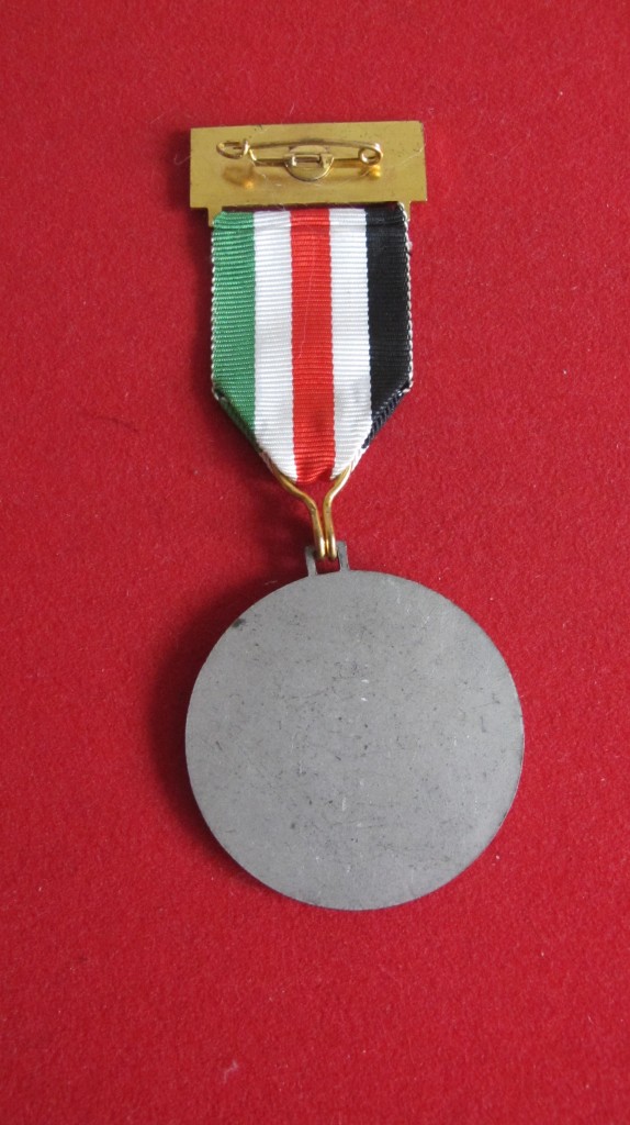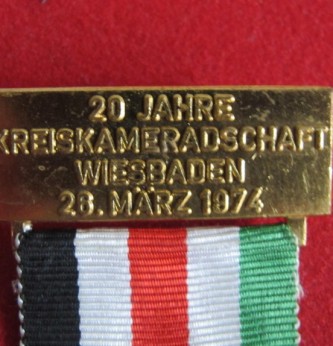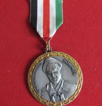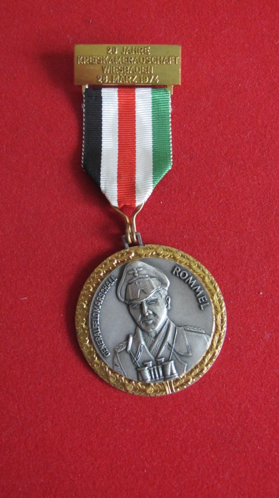 Interesting Post War produced medal for Veterans of the Afrika Korps. Large gilt medal shows Field Marshall Rommel to front. Victory in Africa Green/white/red/black ribbon (same as worn on Wartime Afrika medal). Bar to medal for the war veterans Association of Wiesbaden. Issued 26 March 1974. Good condition.