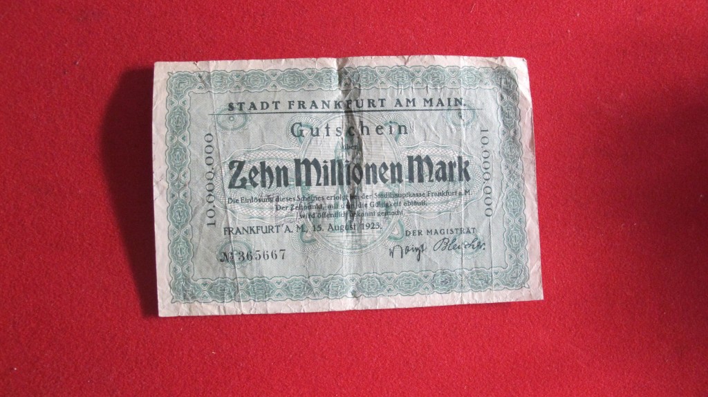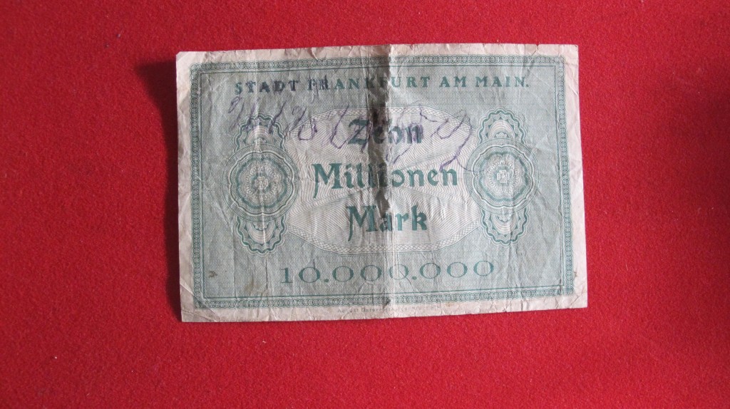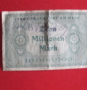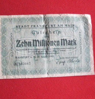 Scarce Frankfurt bank note produced in the 1920s when there was hype inflation in Germany 10 million mark note. Produced in 1923. The German inflation of the 1920s helped Hitler to power as he blamed with Jew for the German economy during this period.