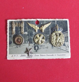 Interesting veteran bring back postcard mounted with various Italian WWII military badges. Consisting of gilt brass cap badge, Fascists lapel pins with fixing to reverse, winged fascists emblems and Lt. Star and Engineers arm badge. Compiled by British veteran and brought back from North Africa as war souvenir and probably collected from POWs. Good condition.