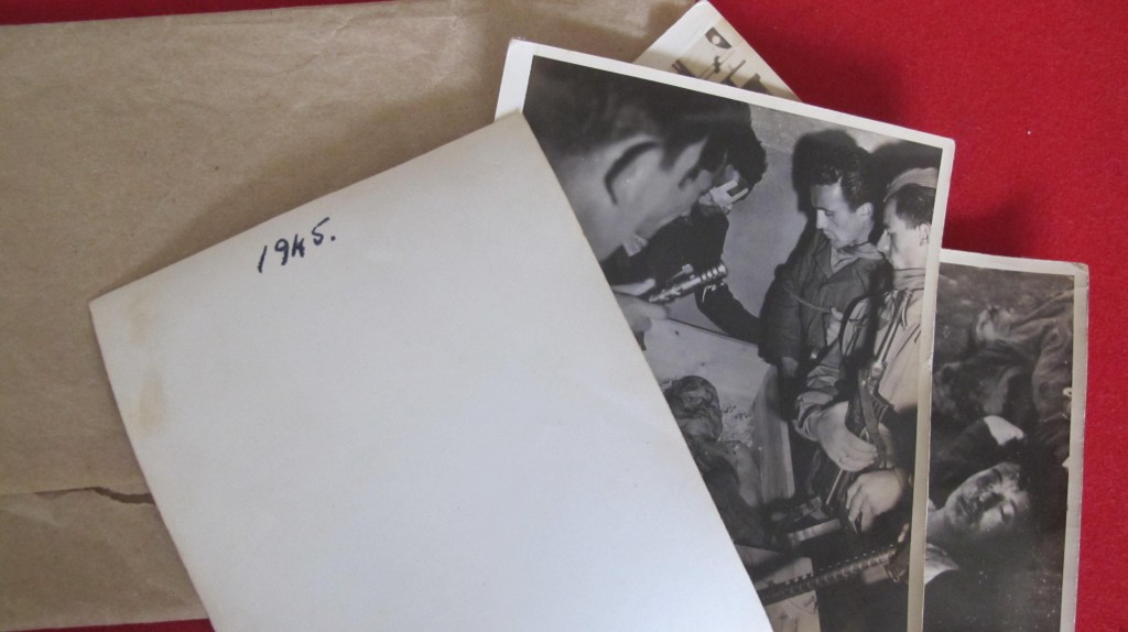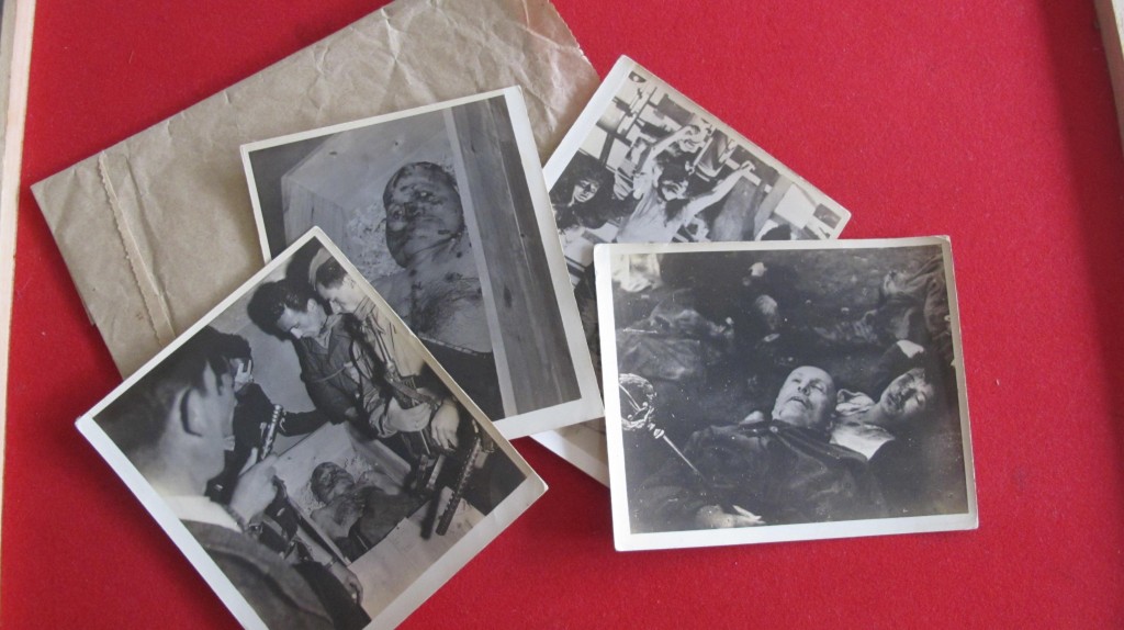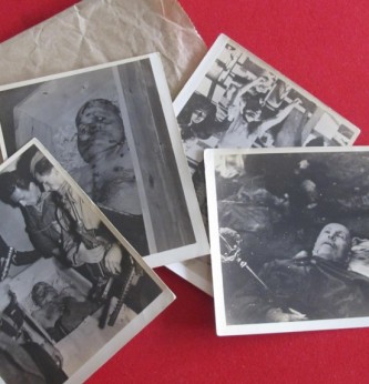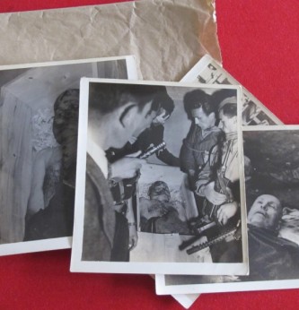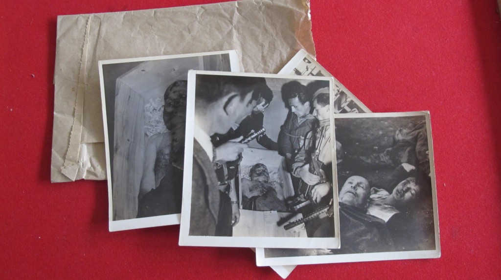 4 period photographs documenting the murder by Italian partisans of Mussolini and his girlfriend Clara Petacci . Thee four original snap shots taken in 1945 and still in the brown paper bag that the veteran brought them back home in. Shows them both strung up in the square in Milan. Also close photos of him laid out in his coffin after they were taken down. A unique set of photos of this gruesome event.