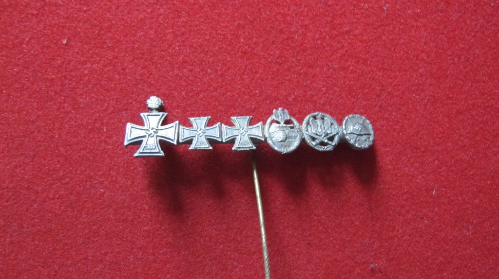 Scarce Third Reich combat bar stick pin. Consisting of Knights Cross with Oakleaves, Iron Cross lst and 2nd Class, Panzer Assault badge, General Assault badge and