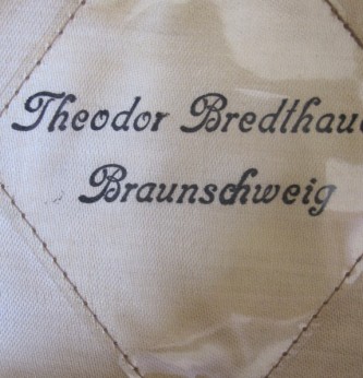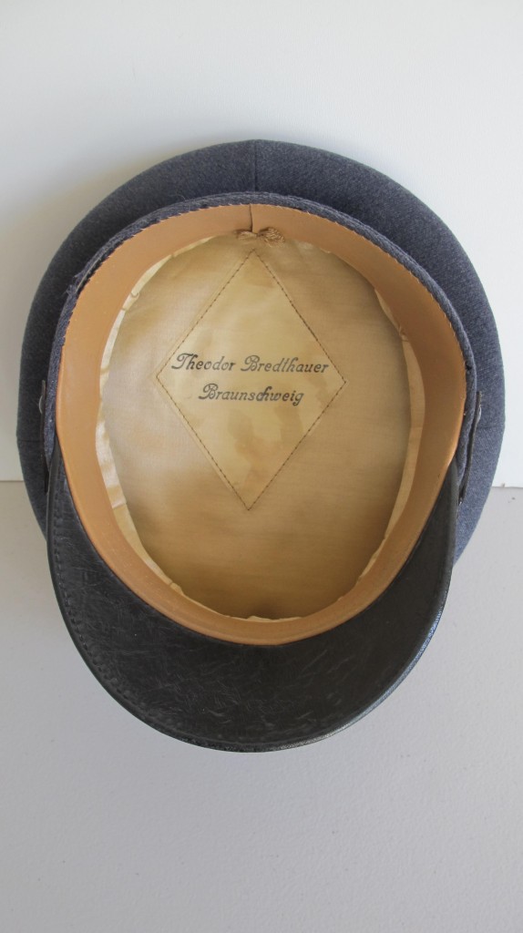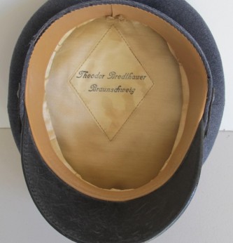 Scarce and seldom found DLV NCOs peaked cap. Nice saddle shaped tall front with early DLV metal insignia. Retains its original silvered wash. Blue wool cap with lower black ribbed band. Complete with original leather liner and maker marked sweat diamond to crown (Theodor Bredthauer, Braunschweig). One small moth nip to crown of cap. Otherwise very nice condition. A good example of this scarce peaked cap.