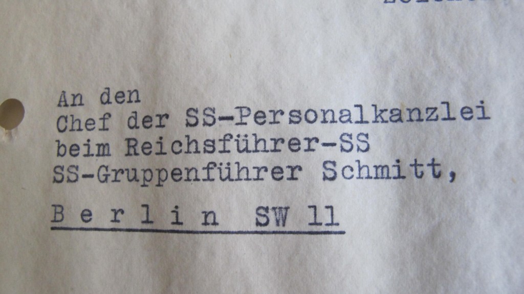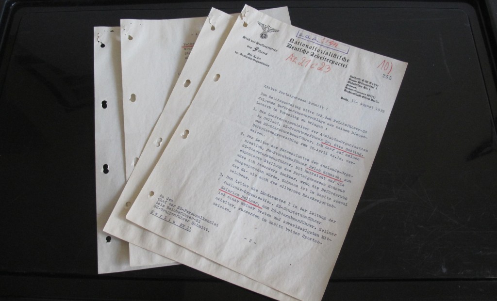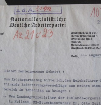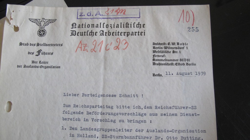 Interesting grouping of documents on stationery of the Leader of the Ausland Organisation. On the staff of the deputy of the Fuhrer and dated August 1939 addressed to the Chief of the SS personnel at the Chancellery of the Reichsfuhrer. Detailing a request to Schmitt for Himmler to receive the enclosed list at the next Party Rally of pro9motions of staff in the Ausland Organisation for two officers to be awarded the Honour Dagger. Annotation in red crayon and ink by staff of the personal chancellery. Pg 5 of the grouping signed by Gauleiter Bowle, Leader of the Ausland Organisation and SS Gruppenfuhrer.
