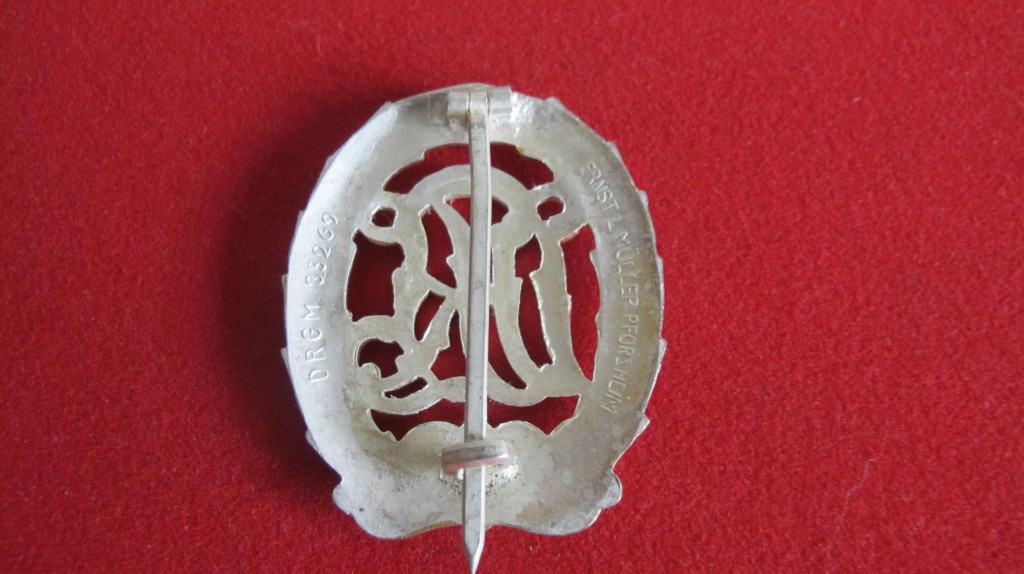 Third Reich DRL silver grade sports badge special issue for War Disabled. Complete with pin and hook back fixing. Good condition. Retains all its original finish and maker marked to reverse.