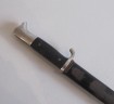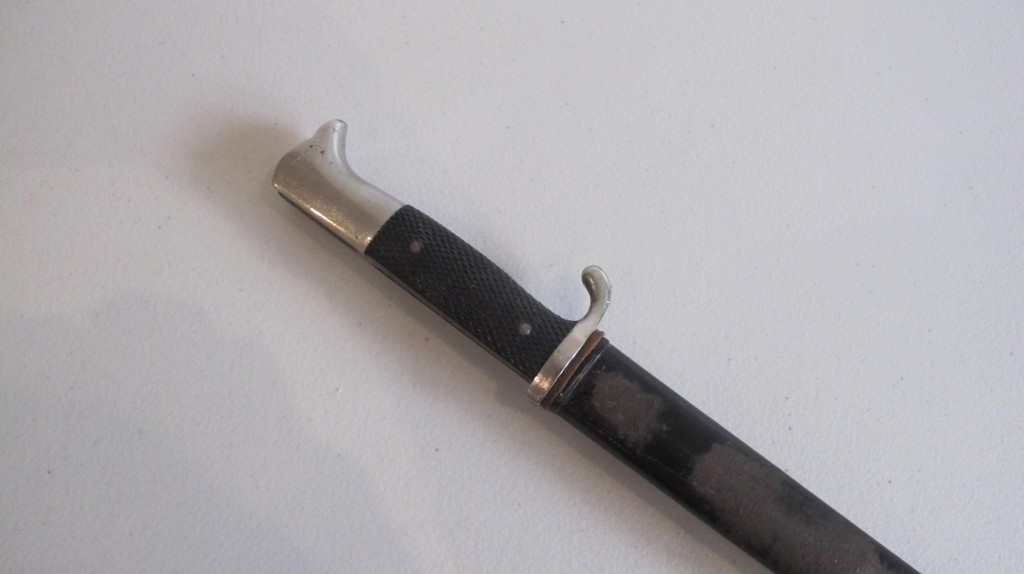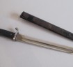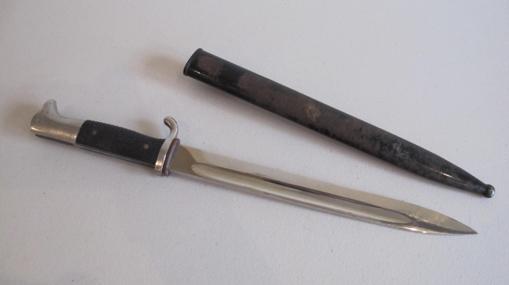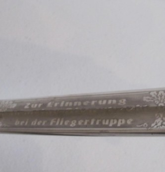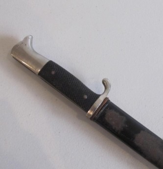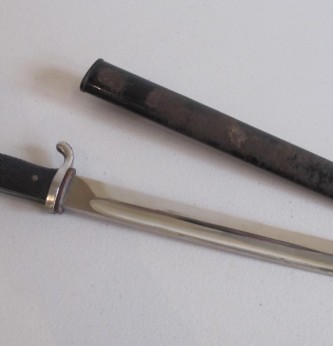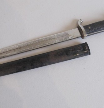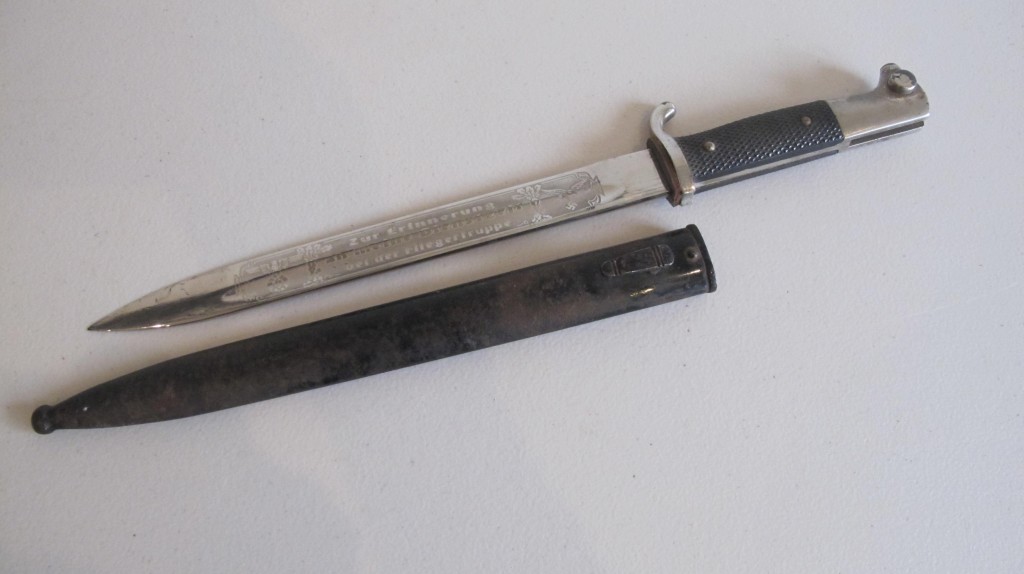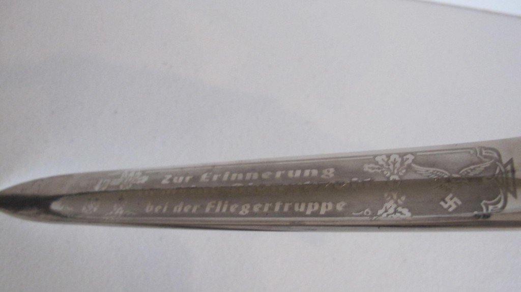 Third Reich Dress Sidearm. Nickel eagle head top. Blade engraved to one side “In Memory of My Service” in German gothic script. and “with the flying troops”. Engraving shows early Luftwaffe droop tail eagle with oak leaves and Political style eagle. Comes compete with its correct pattern scabbard with 70% of its black paint finish. Overall good condition.