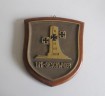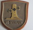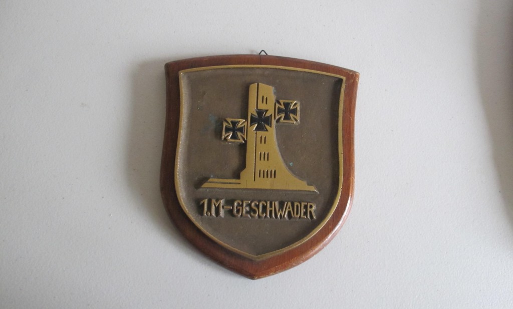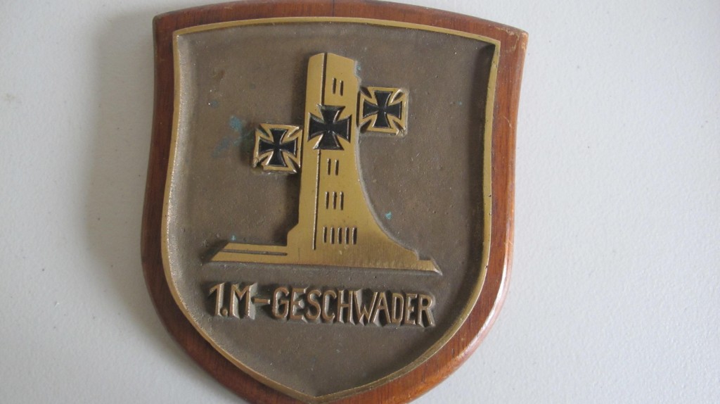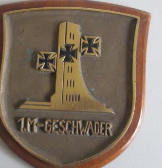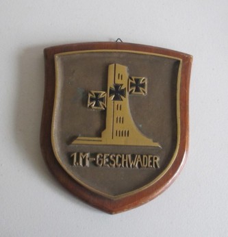 Third Reich German Naval lst Geschwader Station plaque. Heavy brass construction mounted on wooden display shield. Measures 17 x 20cm approx. Shield back has information from the Imperial War Museum London. Good condition.