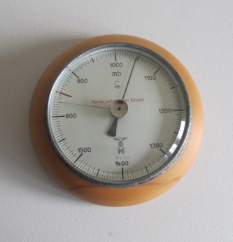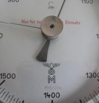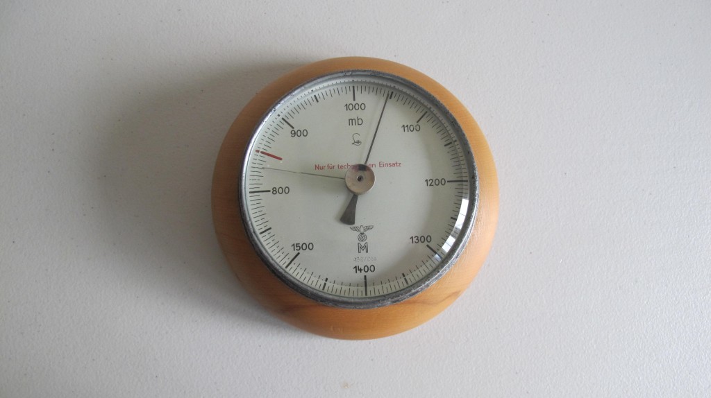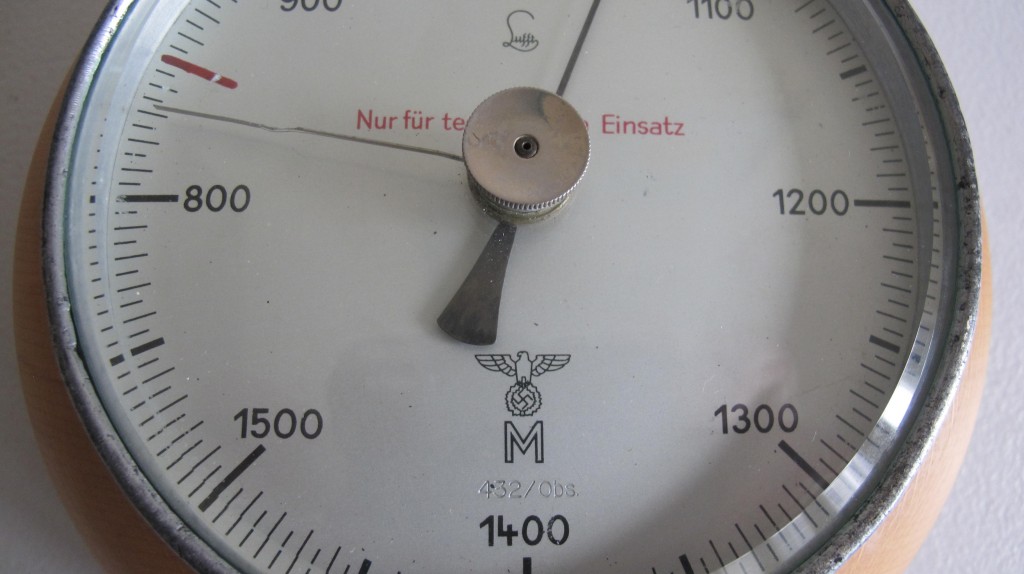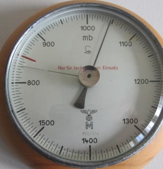 WWII German Naval issue Barometer. Complete with its original glass front. Marked with manufacturers logo and eagle and swastika marine issue stamp. Nice condition. Marked to face of clock “Nur Fur Technischen Einsatz” (For Technical Use Only) Issue numbers 432/OBS.
