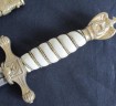 Good wire grip German Naval Officers Dirk. White bakelite grip with wire binding intact. Excellent blade engraved with dolphins and anchor. Retains much original polish. Early Eickhorn manufacturers mark. Complete with correct lightening bolt scabbard. Overall a nice example of this Naval Officer Dirk.