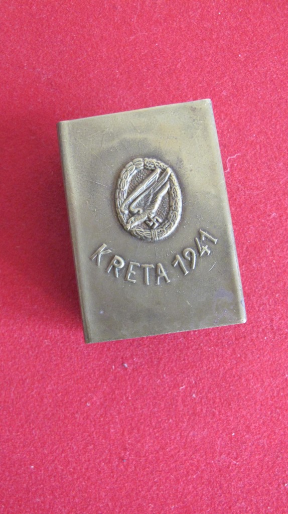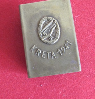 Brass German private purchase matchbox cover. Shows Paratrooper badge of Luftwaffe diving eagle and marked below Kreta 1941. Measures 5.5 x 4cm. Good condition with only minor age wear.