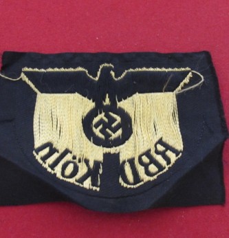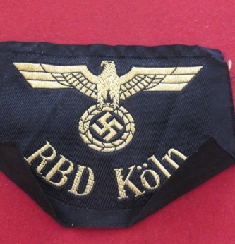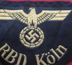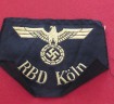 Third Reich bevo state railway arm badge. Railways bevo eagle and swastika and marked “RBD Cologne” (State Railway Directive). Worn on the left upper arm of working jackets. Good condition and cut from roll.