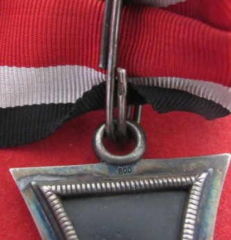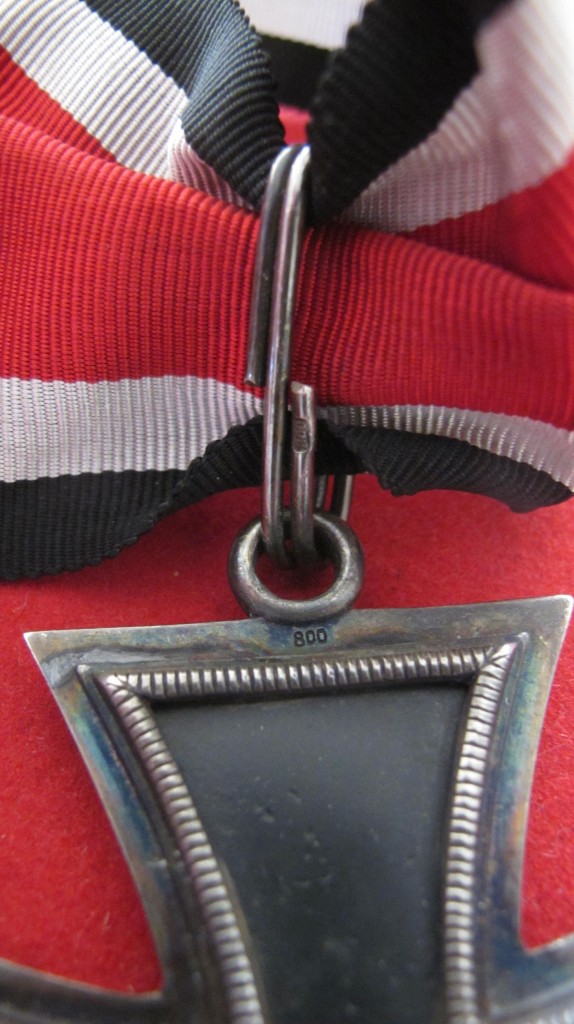 Scarce 800 silver marked Grand Cross of the Iron Cross. Shop display example which would have been displayed in Medal and Awards Outfitters. This being as only one original was ever issued and went to Goring. The Grand Cross was awarded on 19.7.1940 and presented to RM Goring for his Leadership in the Western Campaigns. This outfitters example is three piece construction with iron core in good condition and silver frame nicely toned. Complete with full length neck ribbon.