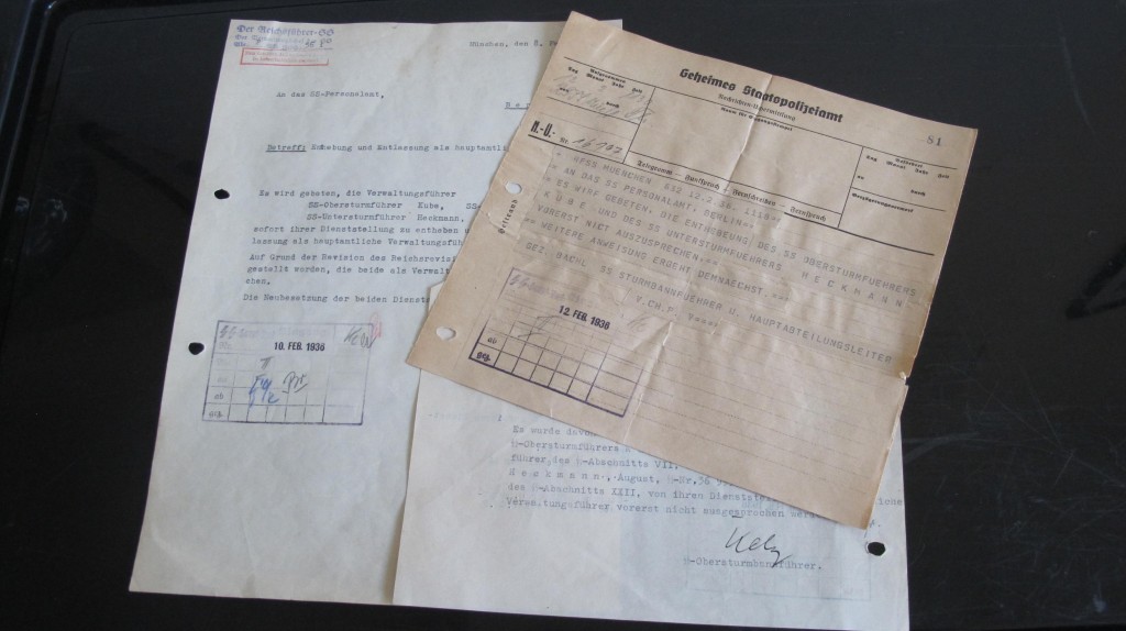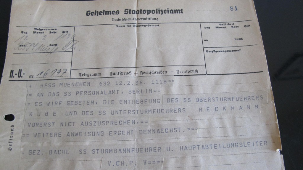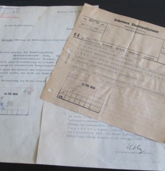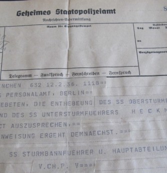 Interesting group of three documents between the offices of the SS and including one telegram from the Secret State Police (Gestapo). Dated 12.2.1936. Concerning the removal and discharge of two SS Administrative Leaders from the respective sectors. Good condition.