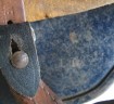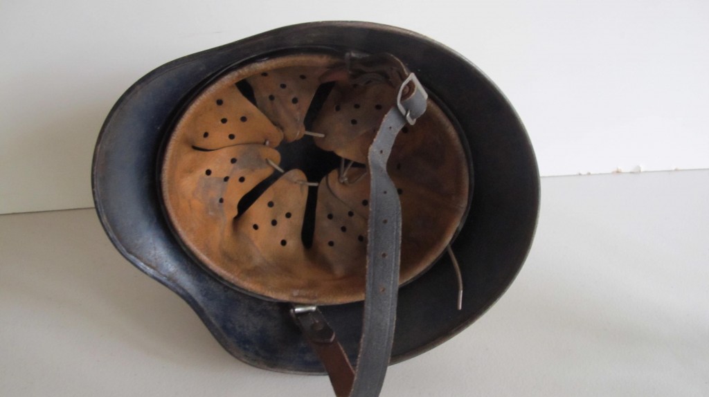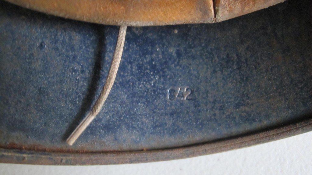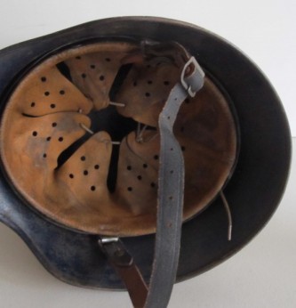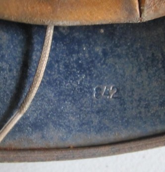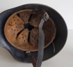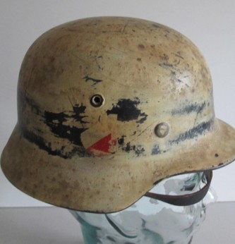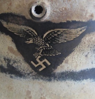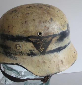 Interesting early droop tail eagle Luftwaffe camouflaged helmet. 90% of Luftwaffe droop tail decal and 50% of its tri colour decal (now partly subdued by its original white winter camouflage paint finish). Complete with original liner and 1942 dated chin strap. Inside rear skirt with original Luftwaffe blue finish. Overall a nice example of this winter camouflage helmet.