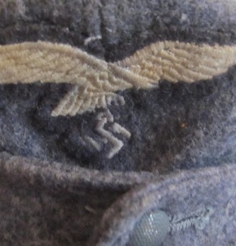 Third Reich Luftwaffe blue wool M43 Cap. Luftwaffe machine stitched eagle to front. As worn by Flak ground units from 1944. Size stamp 57 to inside lining. Lining blue/grey herringbone style. Overall good condition.