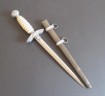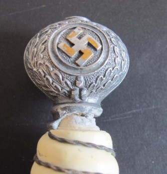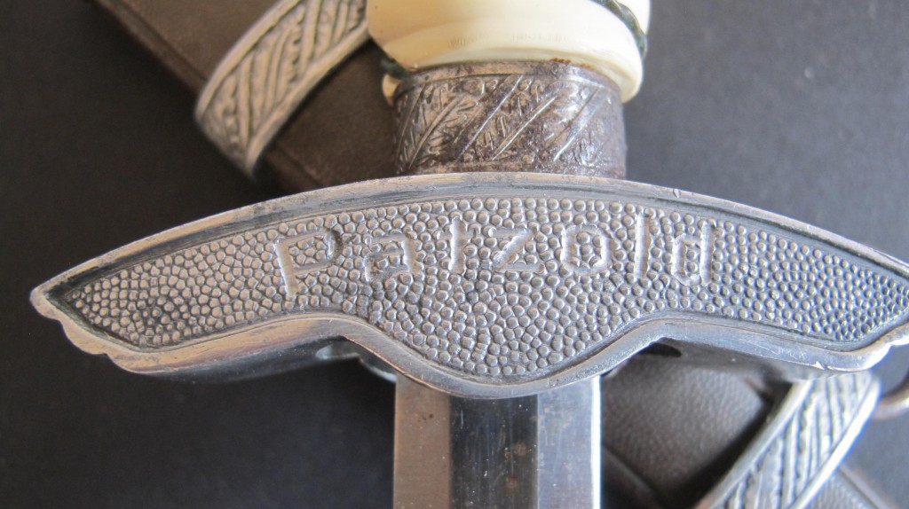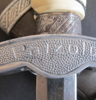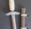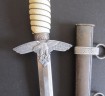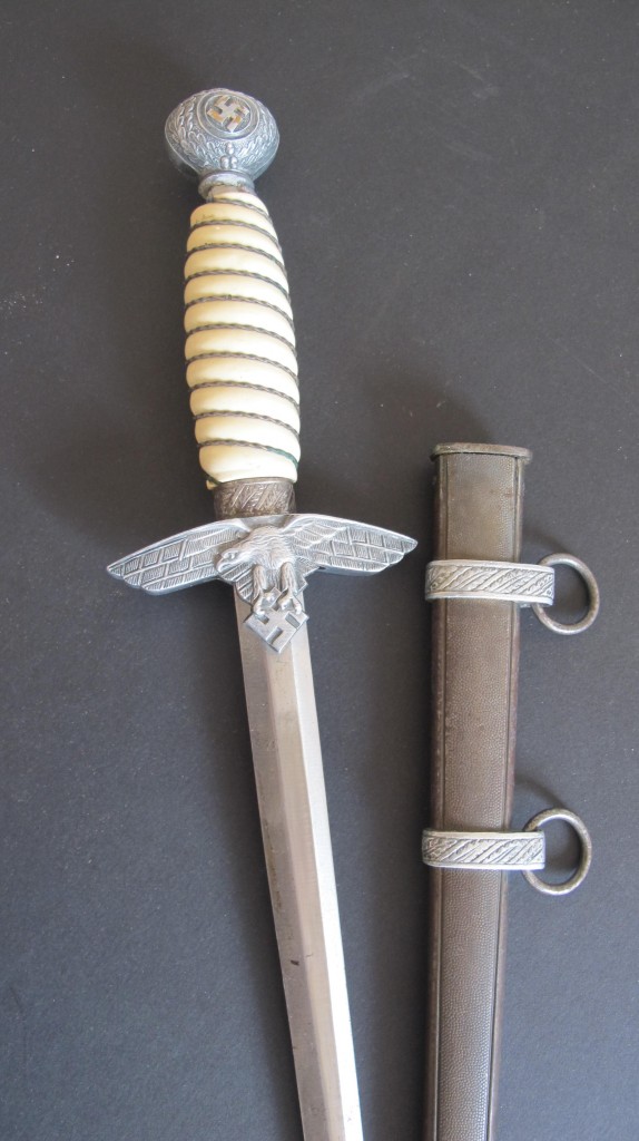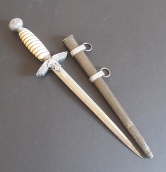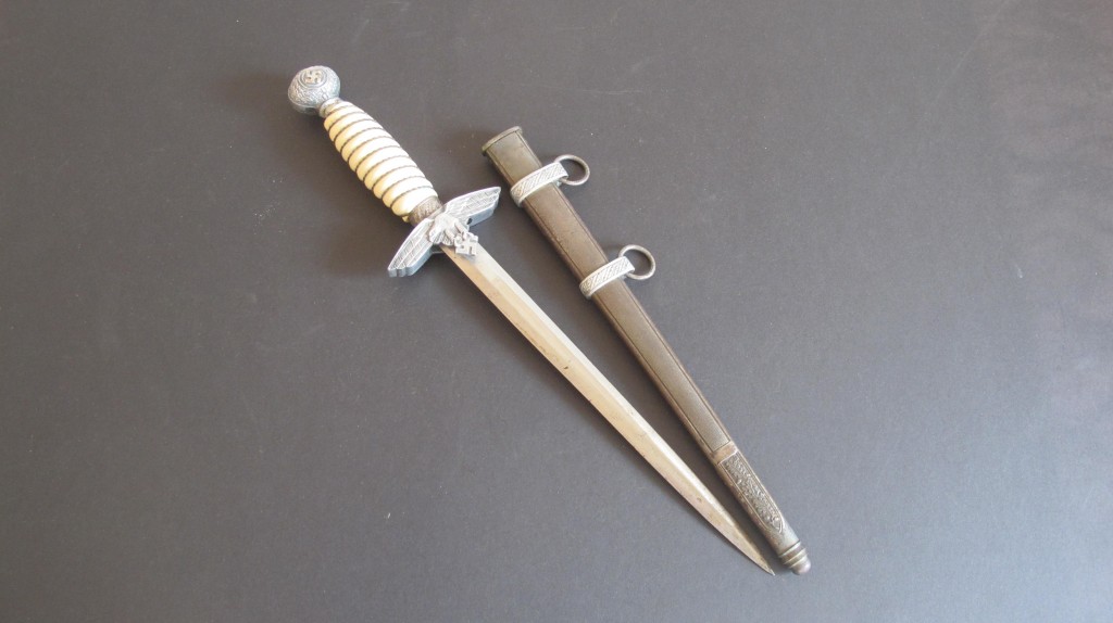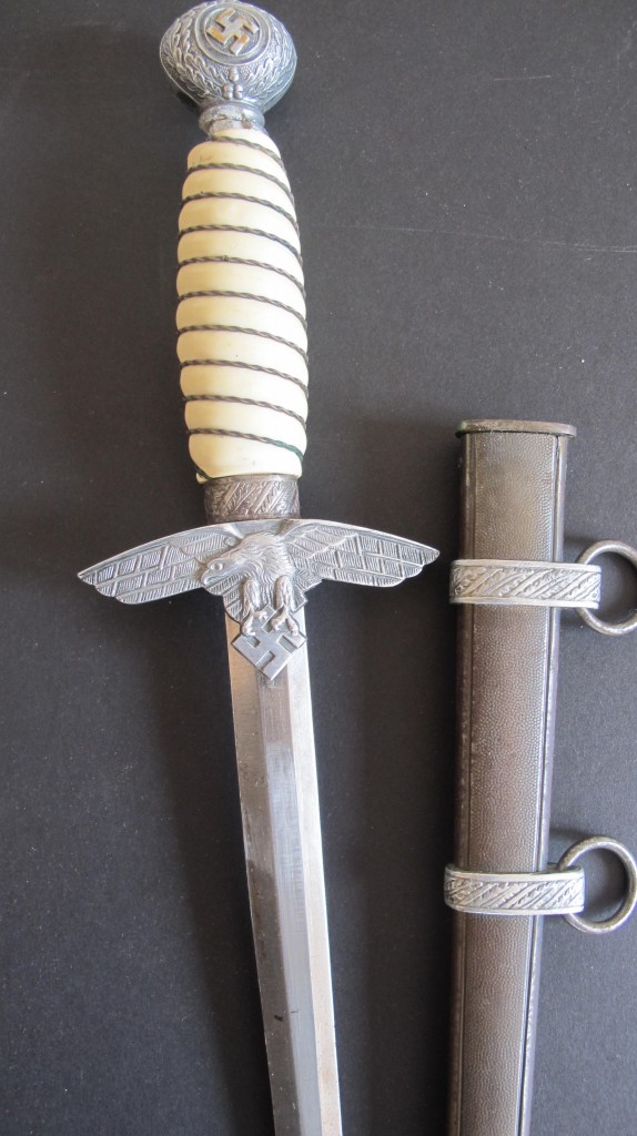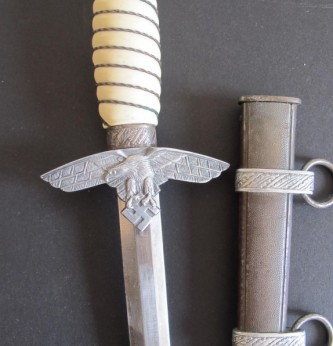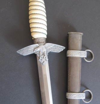 2nd Model Luftwaffe Officers white grip dagger. Pommel with minor damage to lower edge but otherwise good. White bound grip in good condition. Plain blade with just some minor finger staining. Back of grip eagle personalised with original owners name Palzold. Complete with its correct pattern scabbard with two hanging rings. An interesting dagger which could possibly be researched.