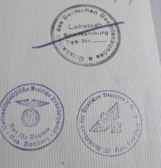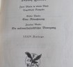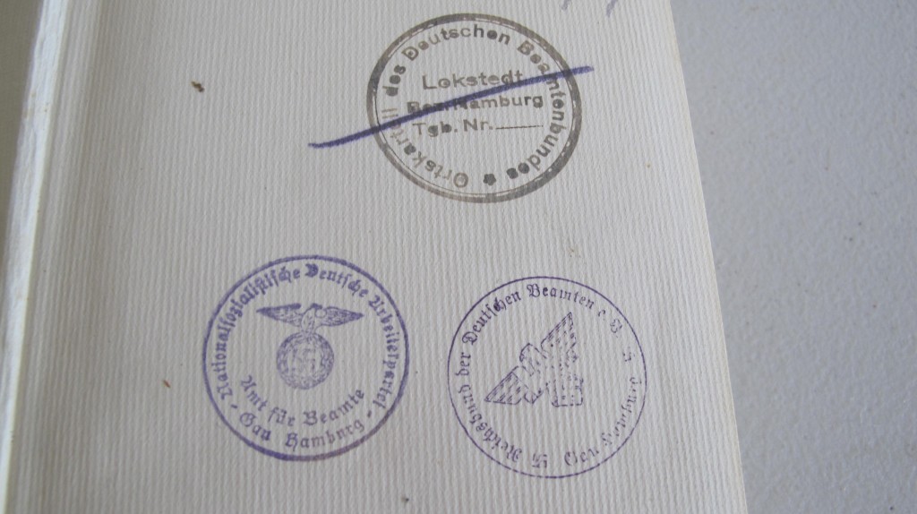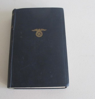 NSDAP Party Headquarters 1933 Edition of Hitler’s Mein Kampf. Inner cover with various Party Headquarters stampings when issued and lent out. Blue leather bound edition. Good condition.