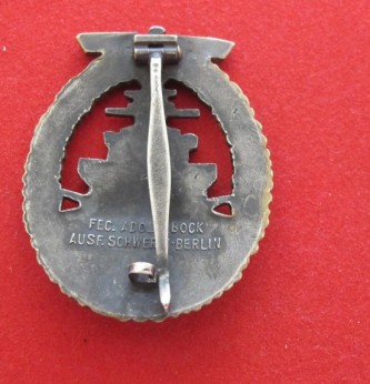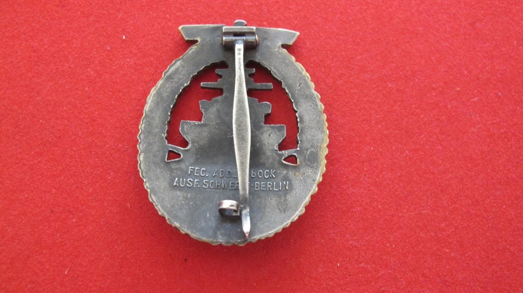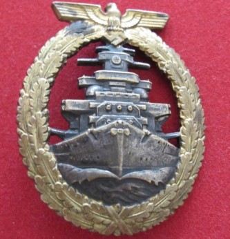 Excellent Third Reich Naval High Seas Fleet war badge. Retains much original gilt finish to wreath and bluing to battleship. Complete with correct pattern pin and hook fixing to reverse. Badge produced by Adolf Bock, Berlin.