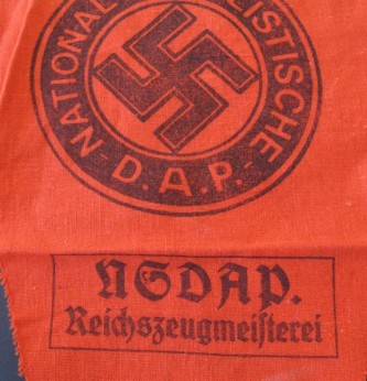 Third Reich single sided NSDAP pennant. Shows black printed NSDAP party badge and marked “NSDAP REICHSZEUGMEISTEREI” . These would have been flown at meetings of high ranking dignitaries and would have been part of a number of pennants flown which were normally just swastikas. Good condition for age.