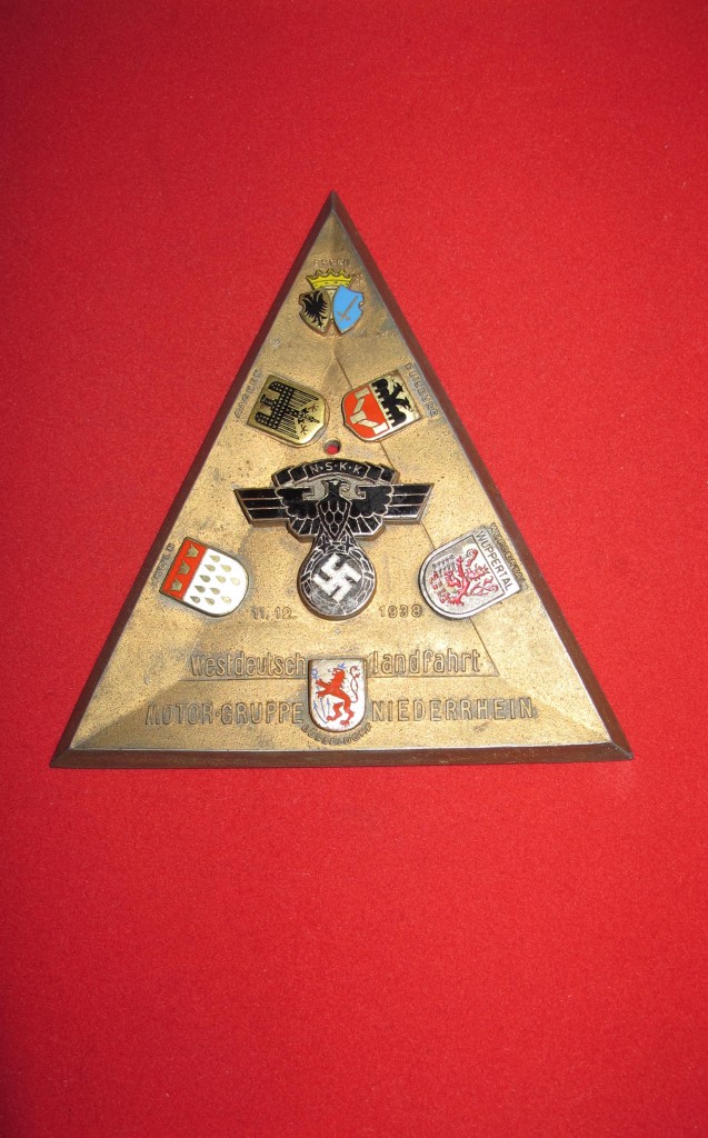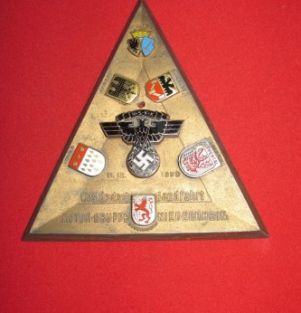 Third Reich NSKK non portable award issued 11.12.1938 for motor group Niederrhein. Each section with shield of the various towns where the rally passed through. Good condition. Measures 13cm x 12cm.