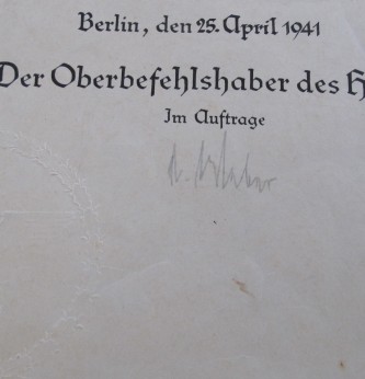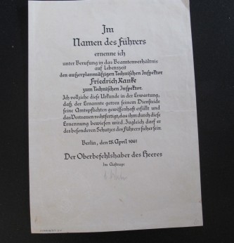 Impressive promotion document for a temporary Technical Inspector in Army service to rank of Technical Inspector. Signed to bottom on behalf of the commander in chief of the Army Berlin 25 April 1940. Document is embossed with Fuhrer eagle in wreath. At one time has been framed but now removed from frame. Good condition.
