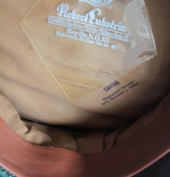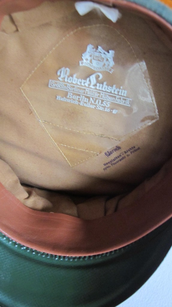 Third Reich rural Police NCOs peaked cap. Excellent saddle shaped cap with brown central band and orange piping. Comes complete with its period attached cockade and Police eagle in wreath (retaining much original silvered wash). Excellent ersatz leather sweatband and Erel manufacturers sweat diamond to crown. A nice example.