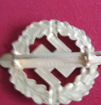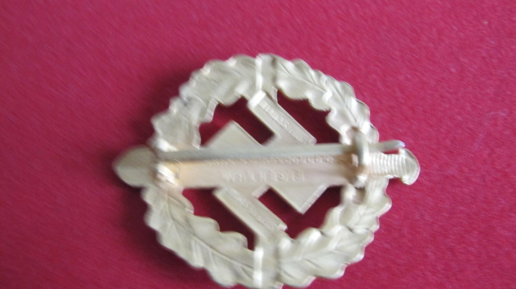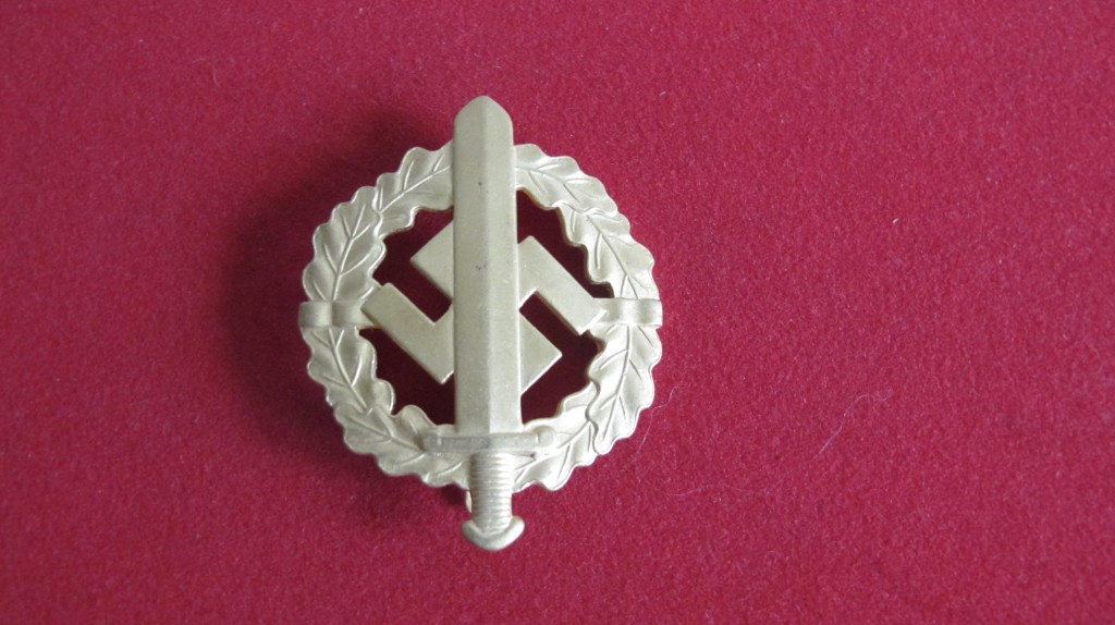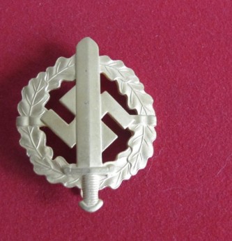 Third Reich SA Sports Award badge. Retaining all its original gilt wash finish. Excellent condition. Complete with pin and hook fixing. Makers detail to reverse. Excellent condition.