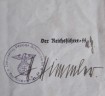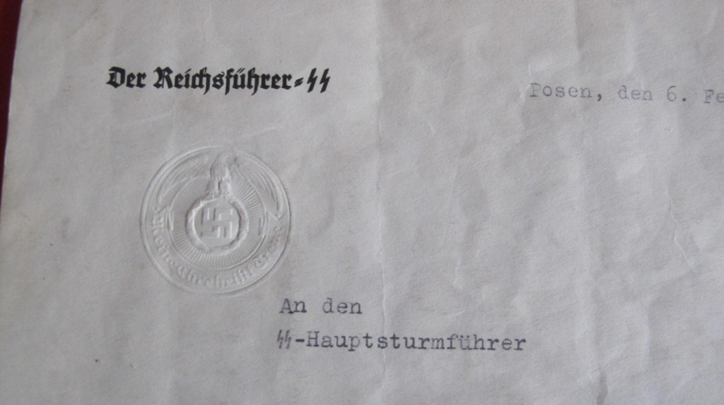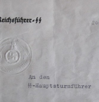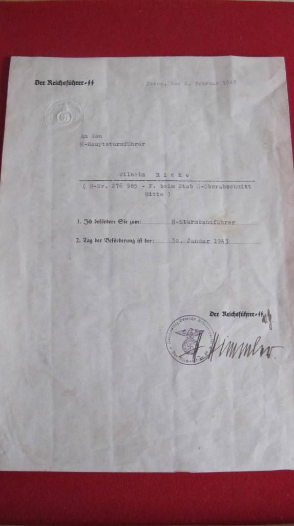 Rare Third Reich SS promotion document with good clear ink signed Himmler signature on his official Reichsfuhrer headed note paper. Promoting Wilhelm Reike SS No: 276985 to the rank of Sturmbannfuhrer (Major). Dated 30.1.1943. Paper embossed with SS insignia. A good interesting document with good clear pen signed Himmler signature.  Good condition.