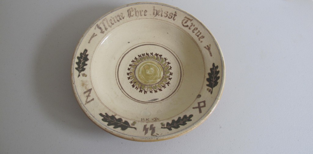 Large Third Reich Stoneware SS decorated bowl. Measures 33cm in diameter. Decorated to top with SS motto and around edge with oak leaves, SS runes and Life symbols. A large interesting stoneware bowl. Drilled to reverse for hanging and display. Marked to base 8.K.XXX. Probably regimental markings. A couple of minor chips to glaze but otherwise good sound condition for age. Probably a veteran bring back piece.
