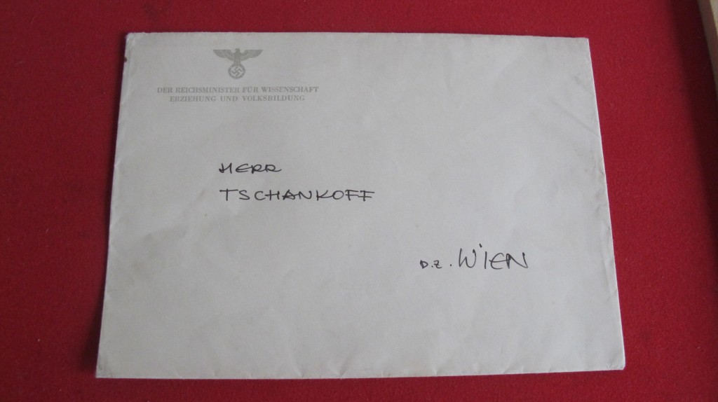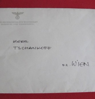 Stationery envelope of the State Minister for Science Training and Popular Education (Bernard Rust). Addressed to Herr Danail Tschankoff, who was the Bulgarian head of the Students League of the HJ in Vienna. Good condition with political eagle to corner of envelope.