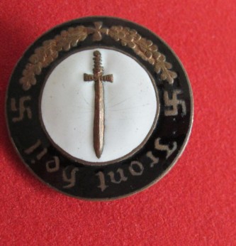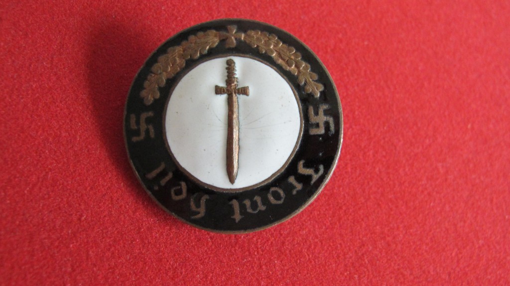 Unusual black and white enamelled screw back badge. Marked “Front Heil”. With sword and swastikas. Possibly early Friekorps or fantasy item?