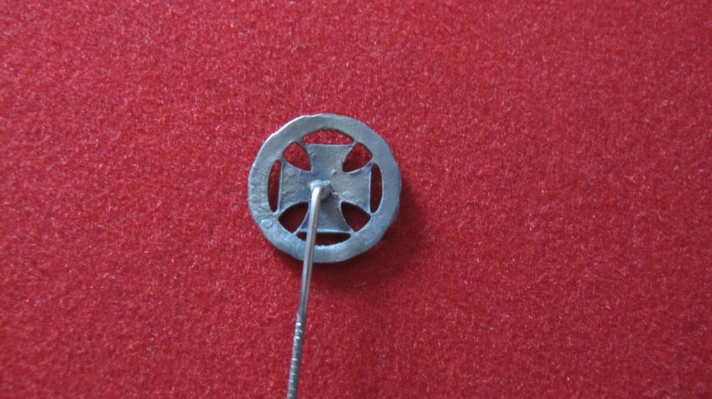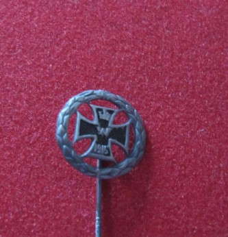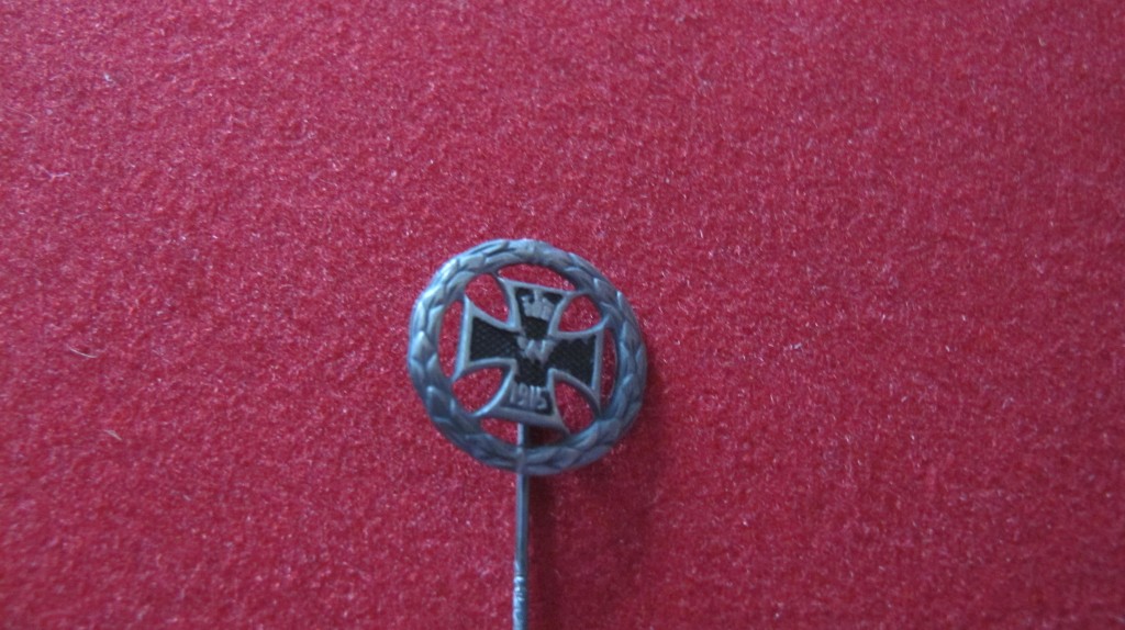 Interesting stick pin showing entitlement to Iron Cross for WWI service. Shows Iron cross in white metal wreath and date 1915. Good condition.