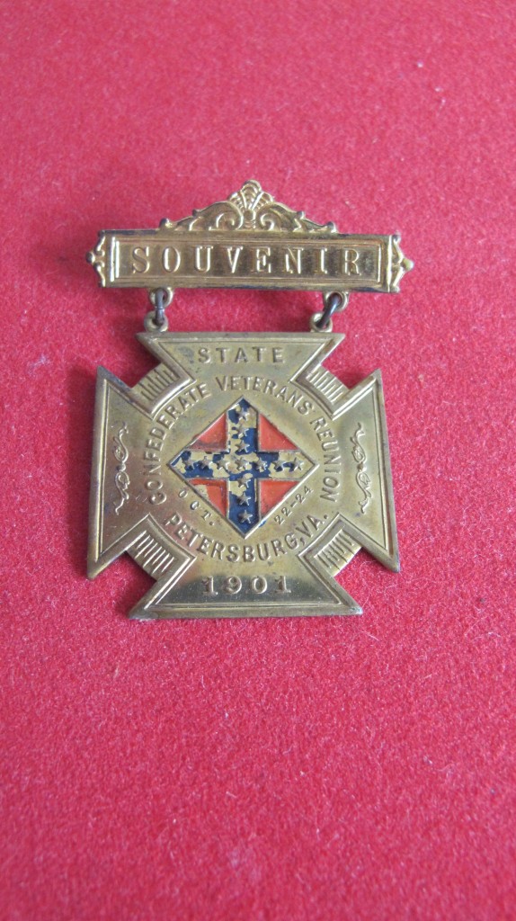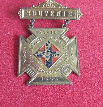 Scarce Confederate Veterans Medal in gilt brass. Compete with pin back fixing. Held for Confederate Veterans Union held in Petersberg VA in 1901. Good condition for age.
