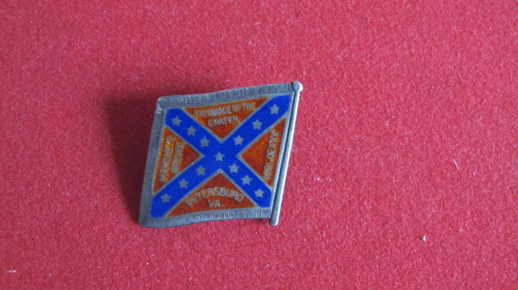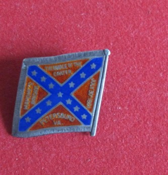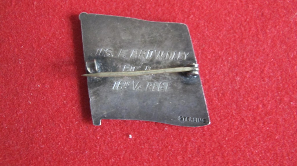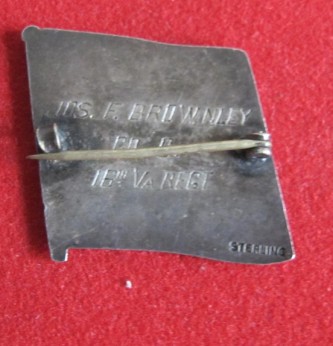 Sterling silver marked Confederate flag badge in red and blue enamel. Marked to front with Peterburg VA, Mahon. Pin back fixing to reverse and personalised to Jos F Brownley, 16th Va Reg. Good condition.