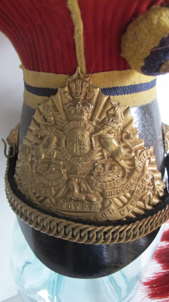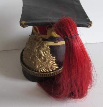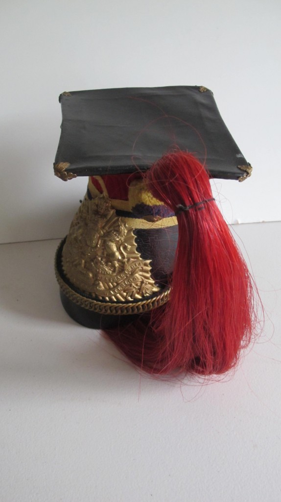 12th Prince of Wales Lancers Other ranks lance cap. Complete with its large Victorian crown Lance pate with Peninsula, Sevastopol and Waterloo battle honours. Yellow and blue pom pom and plume holder. Complete with link chin chain and bosses to sides. Red horse hair plume. Inside cloth and leather liner. Overall nice condition for age.