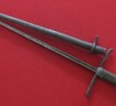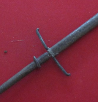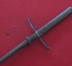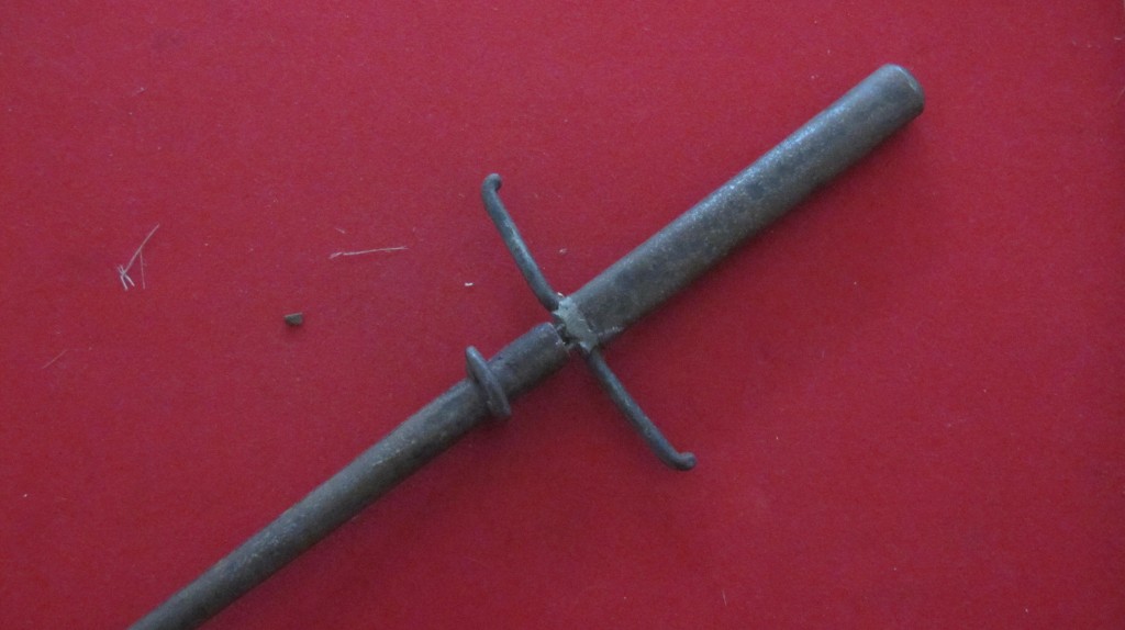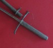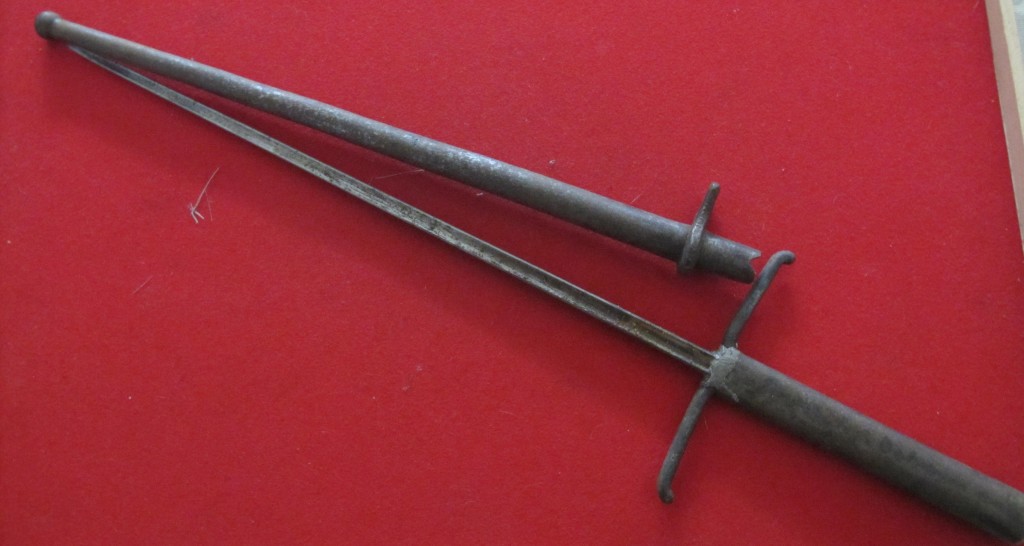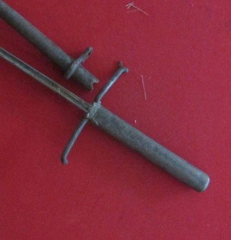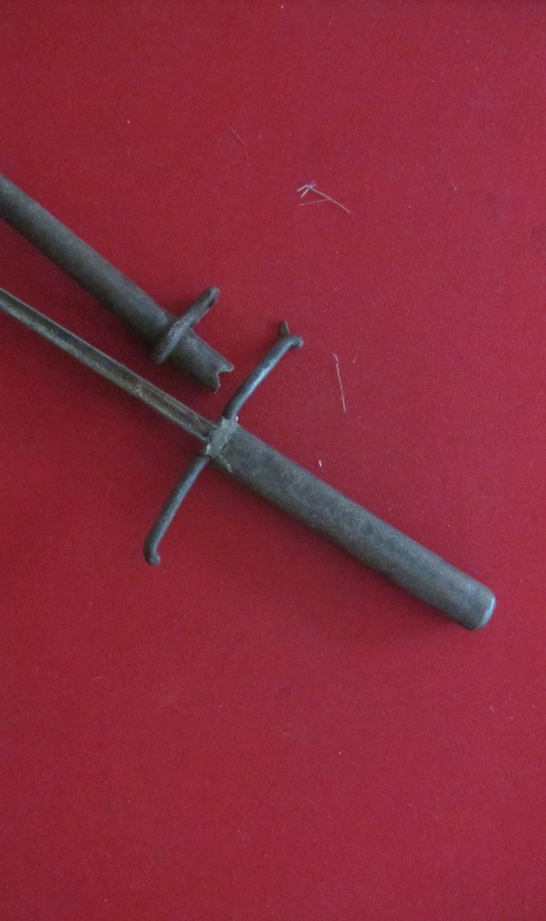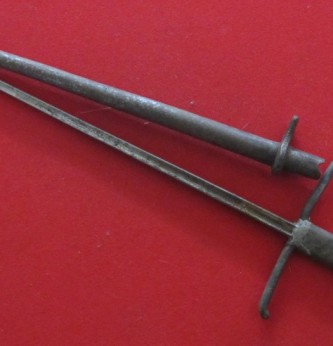 Interesting trench made WWI French fighting knife. Overall measures 39cm in length. Cruciform blade from cut down Label bayonet. Complete with steel cross guard and metal scabbard. An interesting trench produced fighting knife and as carried by French raiding parties.