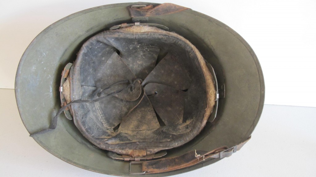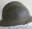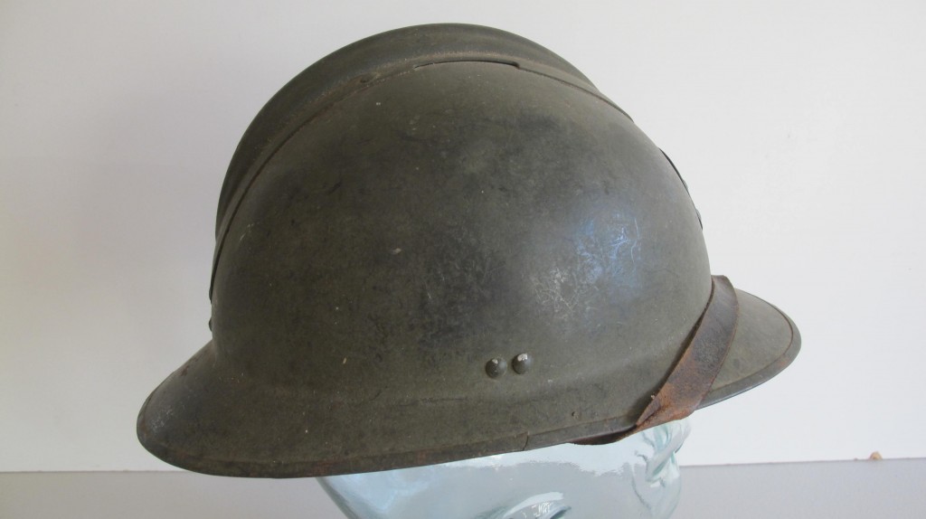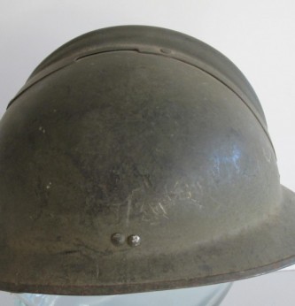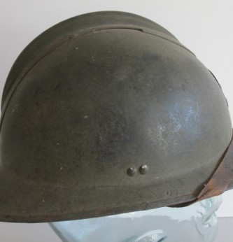 WWII early French 1940s period Artillery issue steel helmet. Retains 90% of its original olive green paint finish. Complete with liner and chin strap. As used by the French Army on the Maginot Line for the defence of France. Good condition for age.
