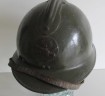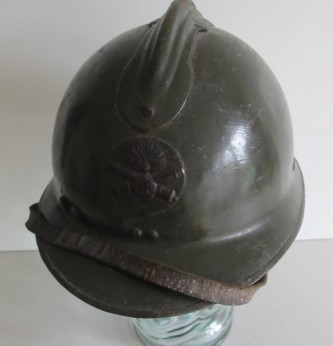 WWII French Army Artillery mans Adrian combat helmet. Olive drab green paint finish. Complete with liner and chin strap and artillery cross cannon helmet plate to front.
