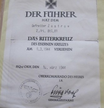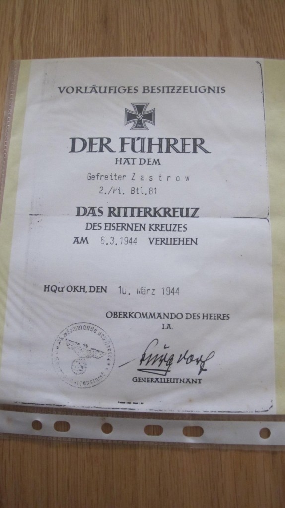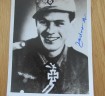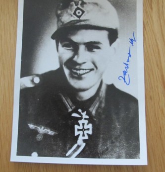 Post war autographed photograph of Unteroffizier Max Zastrow who was awarded the Knights Cross on 6.3.1944. Good condition and with good clear signature and complete with copy of his award document.