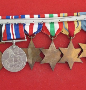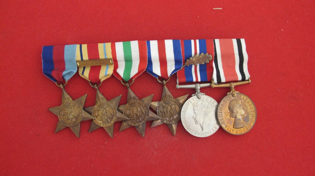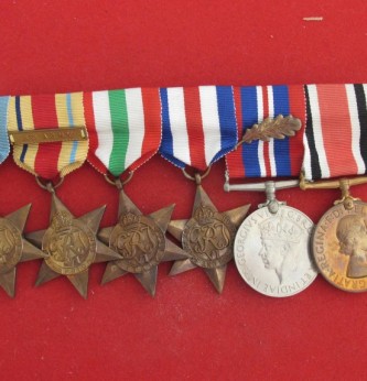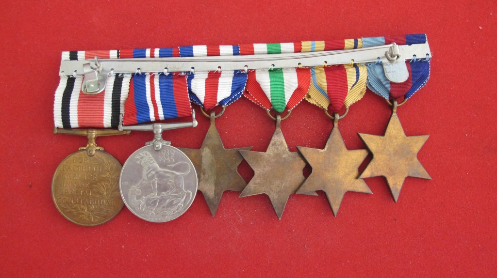 British WWII Medal group consisting of six medals. 1939-45 Star, Africa Star with 8th Army Bar, Italian Star, France and Germany Star and 1939-45 medal. Plus Faithful Service ERII Special Constable Police medal. Named to Percy J Meloy. For his post war Police service. All in good condition.