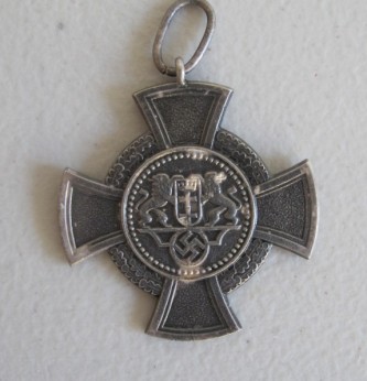 Scarce and unusual Third Reich Free City of Danzig Faithful service cross. Good overall condition with Danzig coat of arms and swastika below. Complete with ring but no ribbon remaining. Ribbon for this is cornflower blue and same as the regular service cross.
