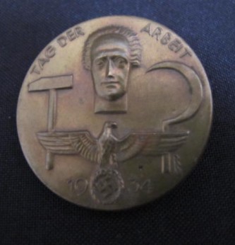 Brass Day rally badge for 1934. Shows eagle and swastika with date and hammer and sickle. As awarded to German workers. Brass stamped out construction with pin back fixing. Good condition.