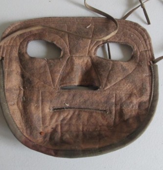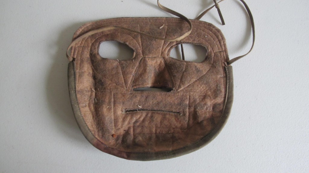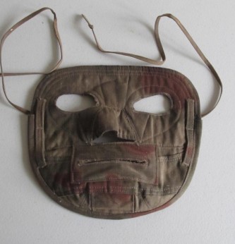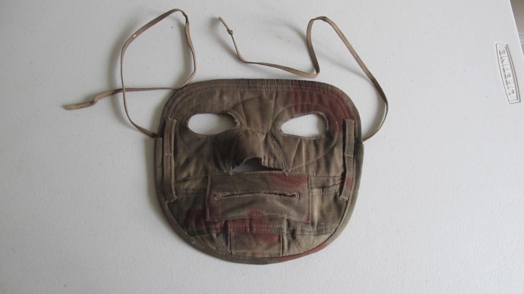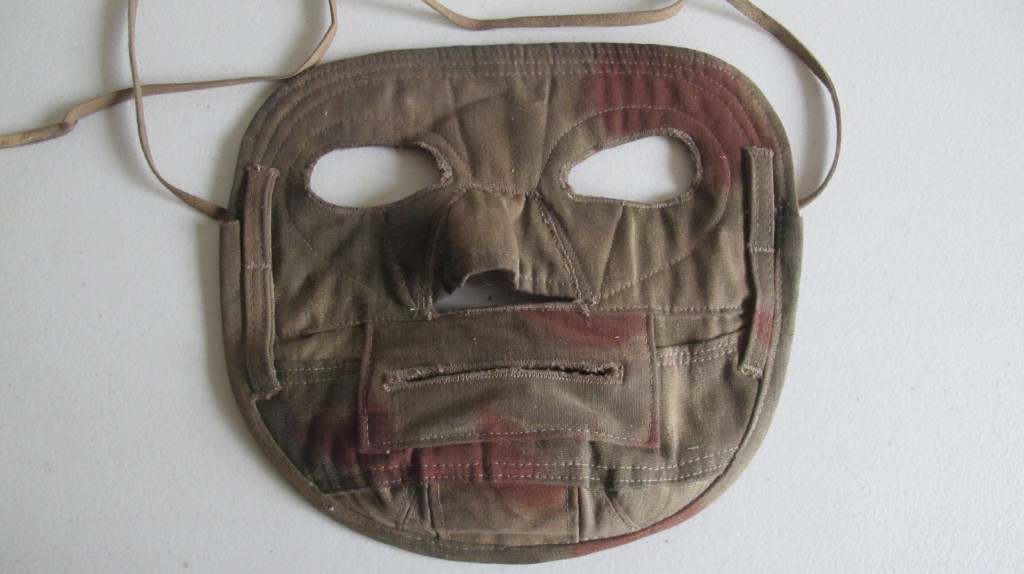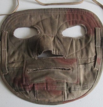 Scarce and unusual tan/water cammo snipers face mask. Cloth lined backing with cammo front and nose and mouth piece. Complete with attachment tie cords and camouflage loops. Scarce and seldom found item of german equipment.