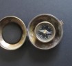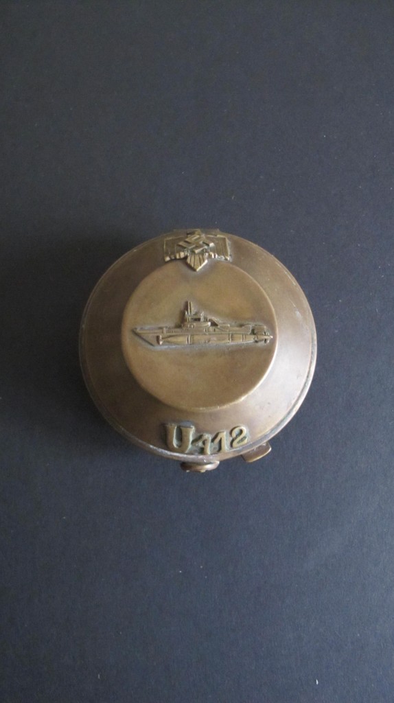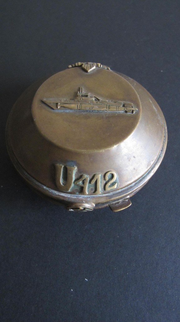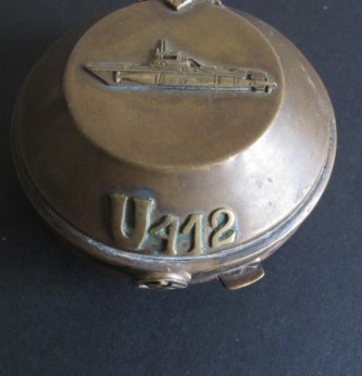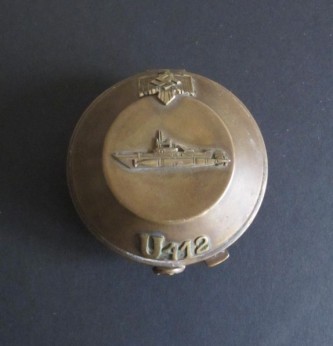 Unusual commemorative hand held compass. Brass construction with eagle and swastika to lid, German submarine and marked U412. Possibly produced to commemorate previous service on this U boat. Opens to reveal compass. Base stamped U412 and 1944. U412 was sunk in October 1942. Therefore, this is probably a commemorative compass. Working order.