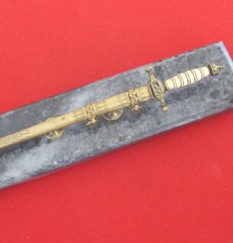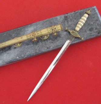 Imperial German miniature Naval Officers dagger. Turned bone handle and Imperial crown to top of grip. Contained in its correct pattern roped scabbard. Scabbard secured and mounted on marble base. As used by Imperial Naval Officer as a letter opener. Measures overall 23cm. An excellent quality item in exact detail to its full sized counterpart.