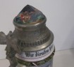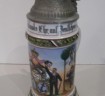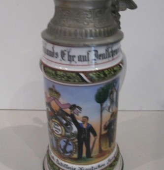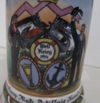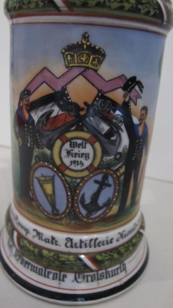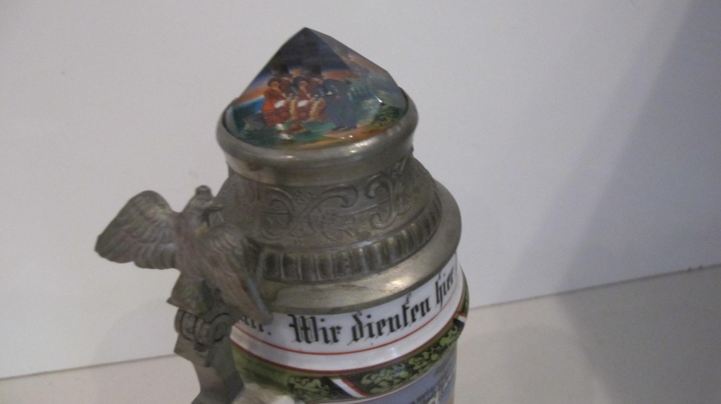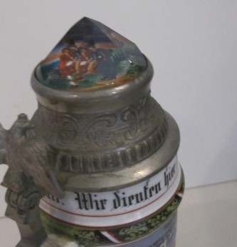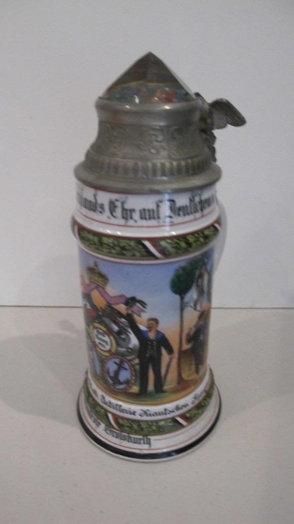 Scarce Imperial German Naval Regimental stein. Pewter top with unusual and seldom found diamond crystal top showing below Sailor with girlfriend before heading off to sea. Front decorated with anchors and Imperial crown. Marked to 3rd Company Naval Artillery Battalion. Excellent example of this rare Naval stein. Very few Naval steins come on to the collecting market nowadays.