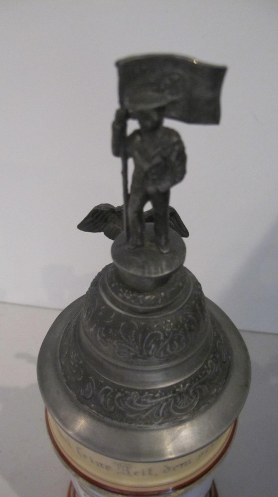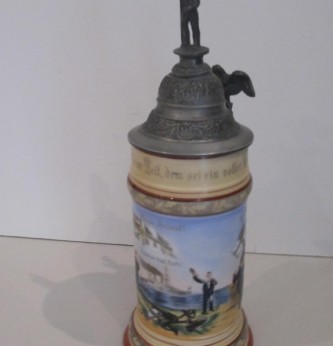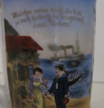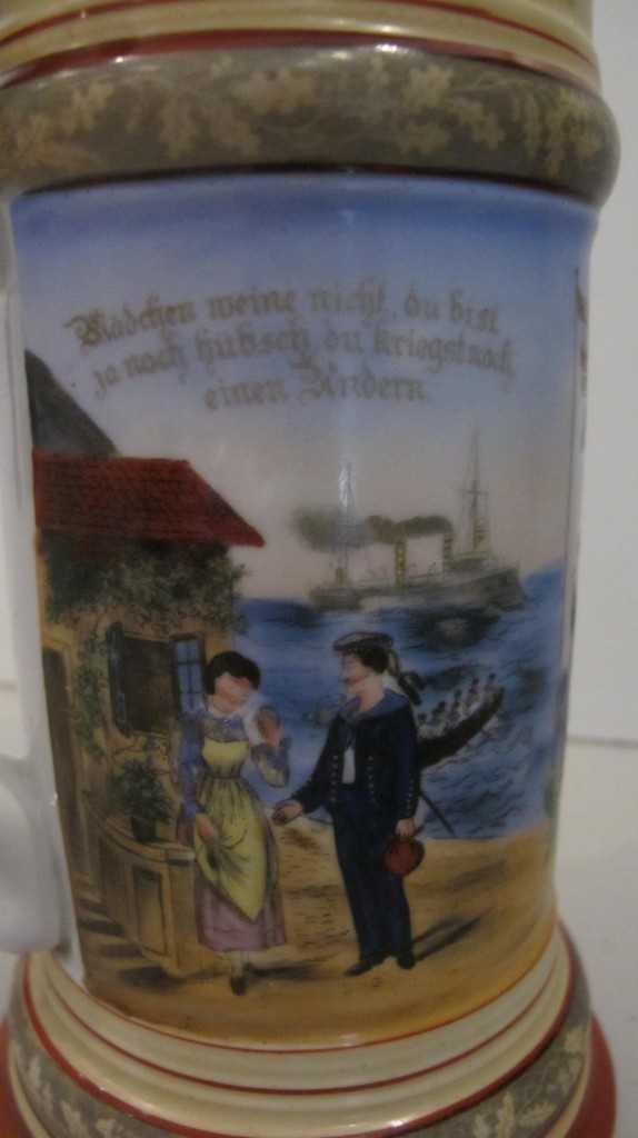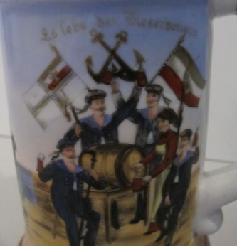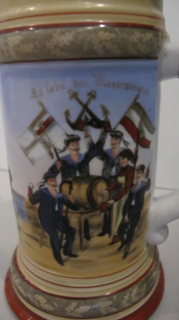 Imperial German Naval regimental stein. Pewter top shows Naval Rating with flag. Stein decorated with Imperial battleship and flags. The Navy steins are the hardest of all regimental steins to find as they were manufactured in smaller numbers. Nice condition for age with no damage.